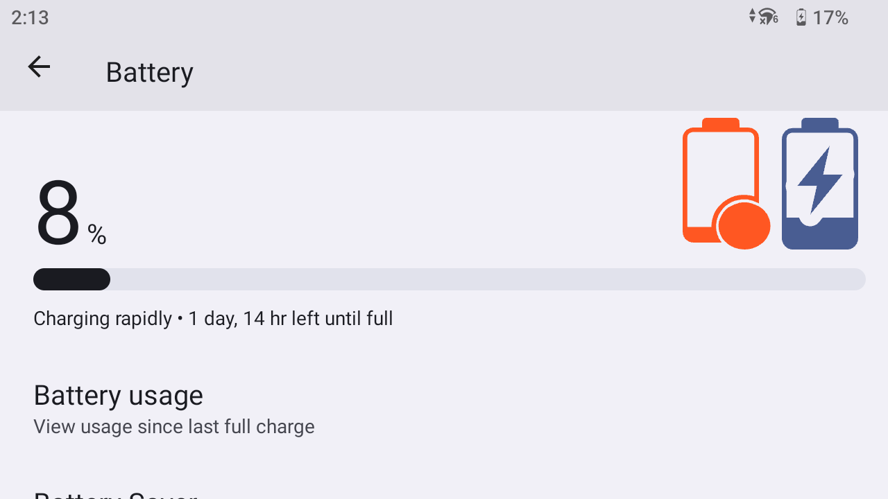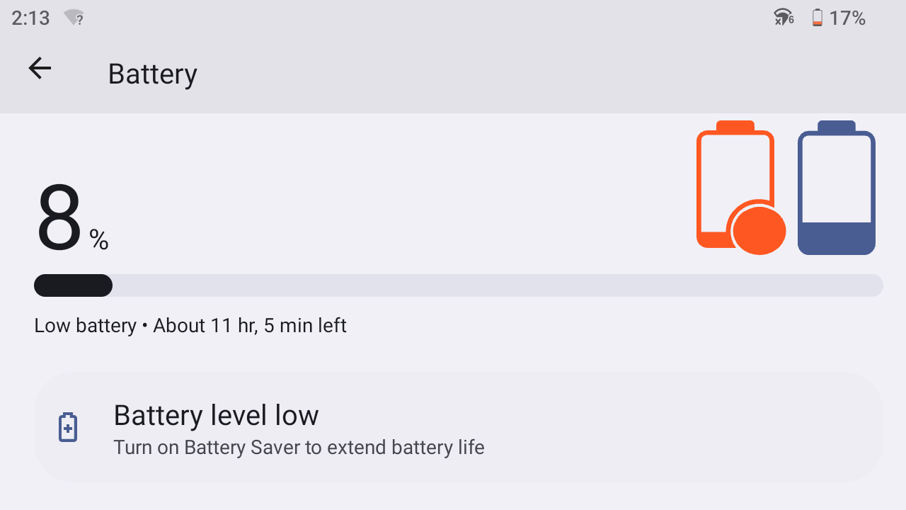 the Battery settings screen below is showing 0% charge for the accessory removable battery and 17% charge for the internal battery, with a combined total charge of 8%: