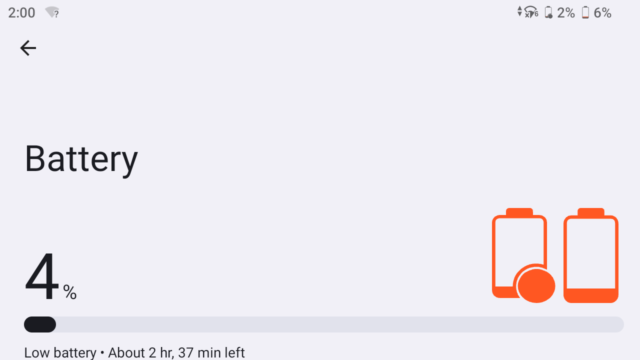 the Battery settings screen below is showing (top right of the screen) 2% charge for the accessory removable battery and 6% charge for the internal battery, with a combined total charge of 4%: