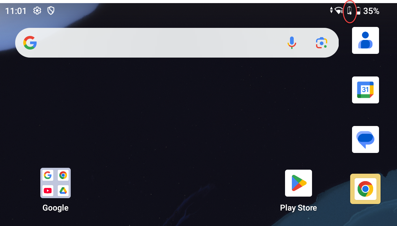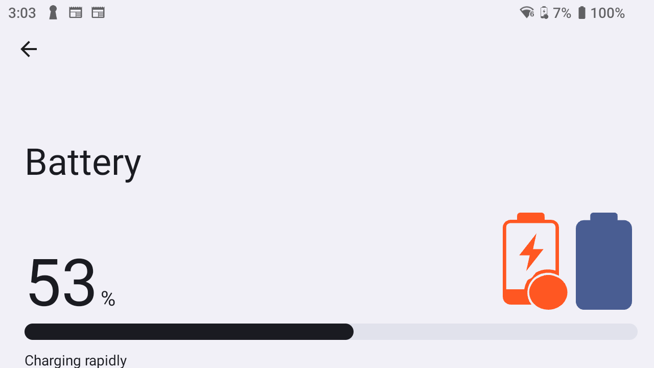 The following image shows that the internal battery is charging, as indicated by the lightning bolt on the internal battery icon. This same icon shows on the Status bar in the Battery settings and on the device's home screen.