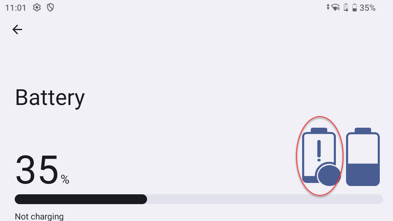 If a fault is detected in the accessory removable battery, the accessory removable battery icon alerts you in the Status bar, under Settings, and in the Battery settings.