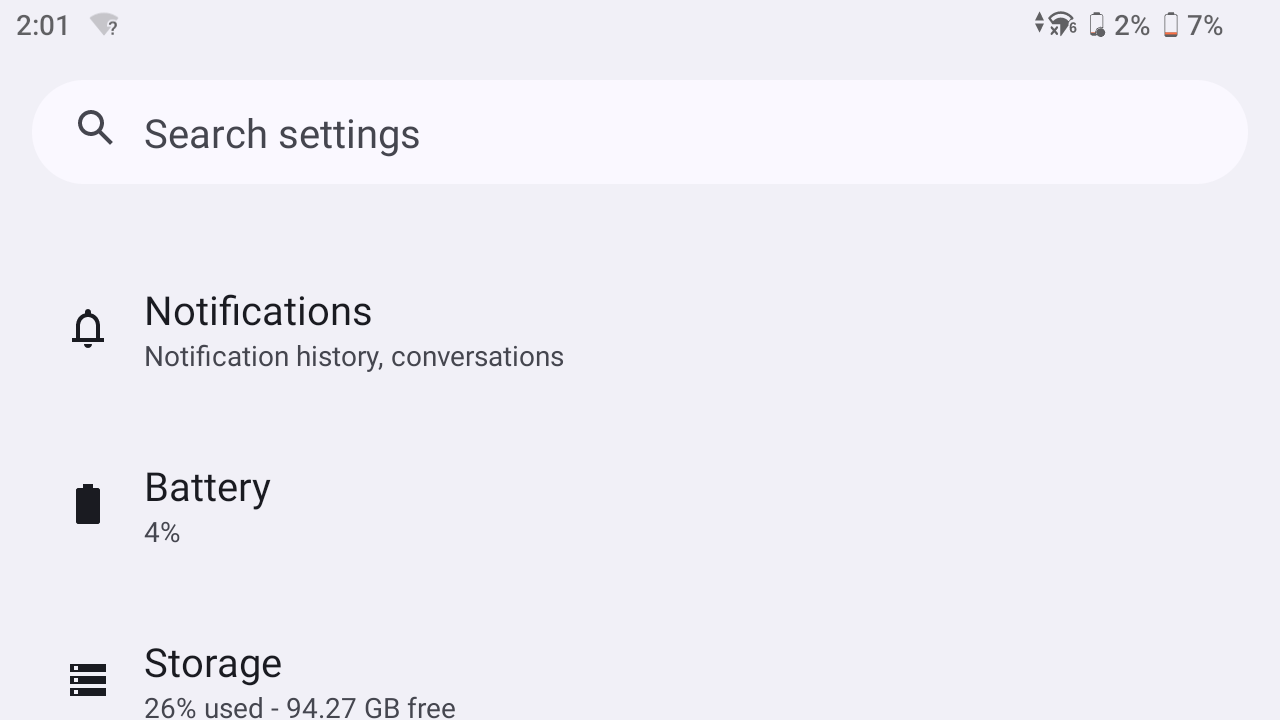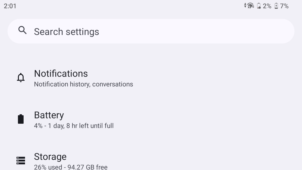 To access Settings, swipe down from the top of the display twice to show all Quick Settings options, tap the Settings icon in the bottom right corner, then tap Battery. Under Battery, the combined percentage charge of the internal battery and the accessory removable battery is displayed:
