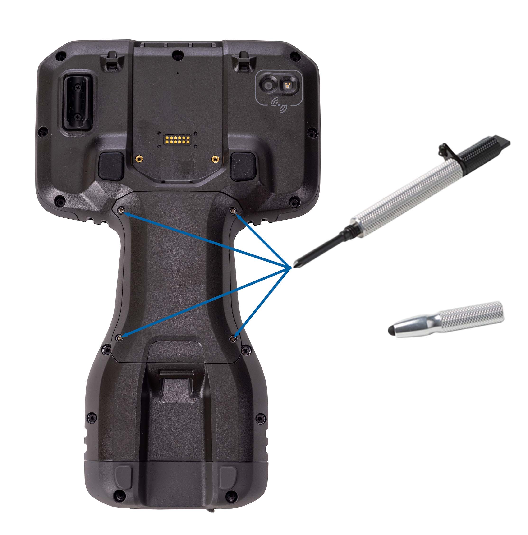 Using the Philips screwdriver, loosen the 4 screws to remove the battery bay cover from the back of the device.