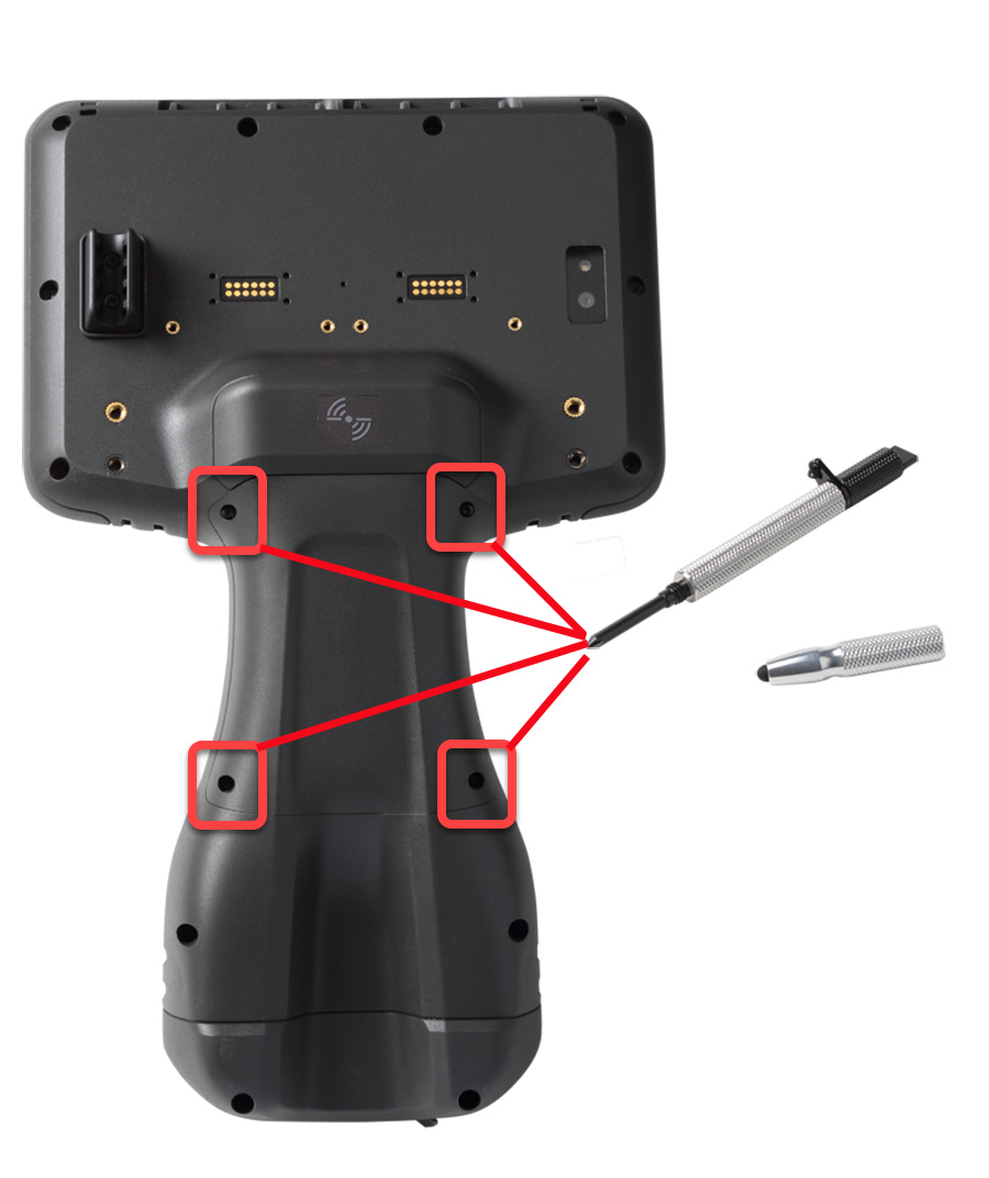 Using the Philips screwdriver, loosen the 4 screws to remove the battery bay cover from the back of the device. -