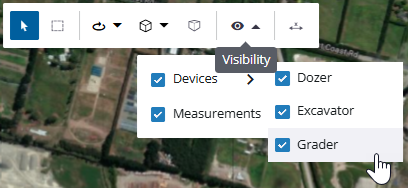 Visibility controls - You can manage visual clutter in the map by using a ‘master’ toggle to show/hide all devices or by using individual toggles to show only specific machine types, such as dozers, excavators, or compactors. The visibility state of machine icons updates instantly on the map and persists for the duration of your current session.