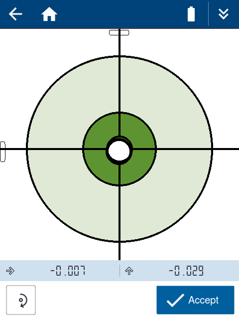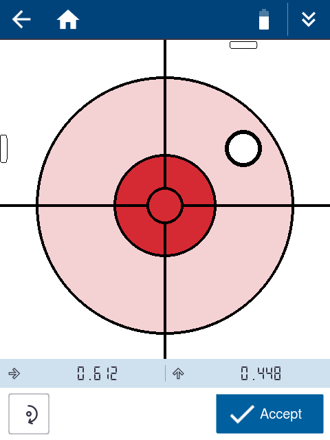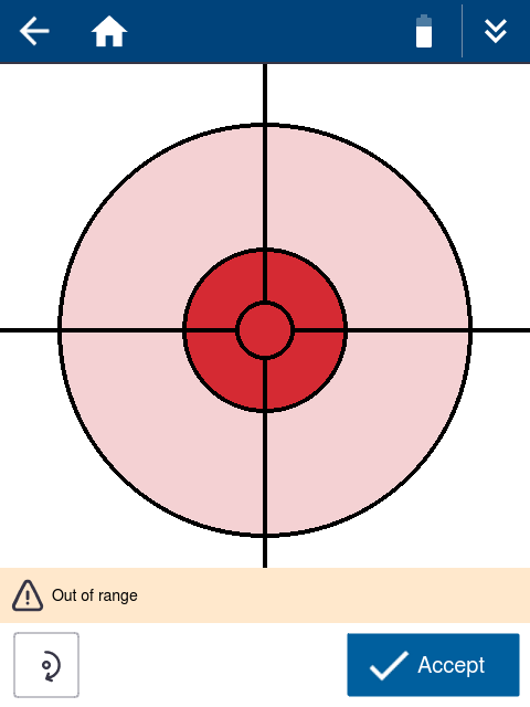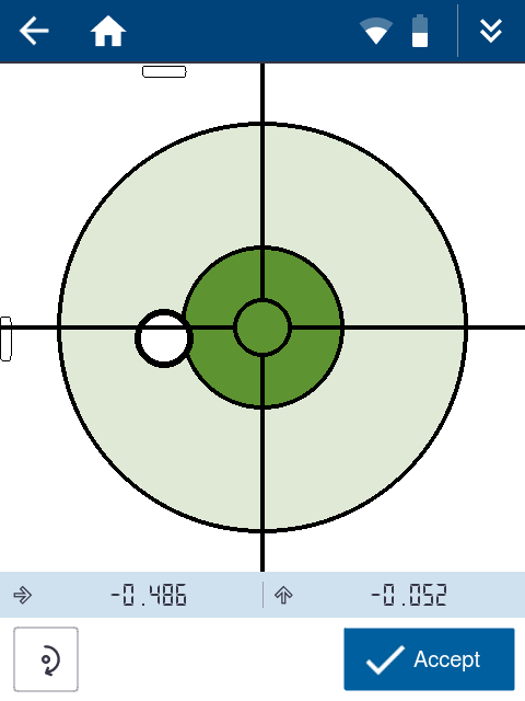 The electronic bubble will display green with the bubble inside the green target area when the scanner is leveled within compensation range of ±0.5°. The target will turn green once the bubble touches the outer edge of the target but it is important to center the bubble on the green target to ensure the scanner remains within compensation range throughout the full scan. Tap Accept when satisfied.