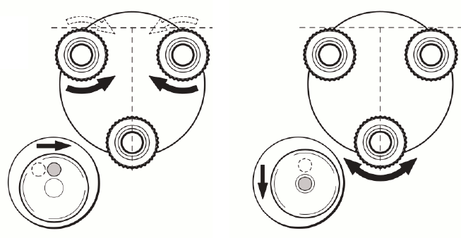 Level the tribrach using the circular level. Turn two of the leveling screws simultaneously in opposite directions. The index finger of your right hand indicates the direction in which the bubble should move. Now use the third leveling screw to center the bubble.